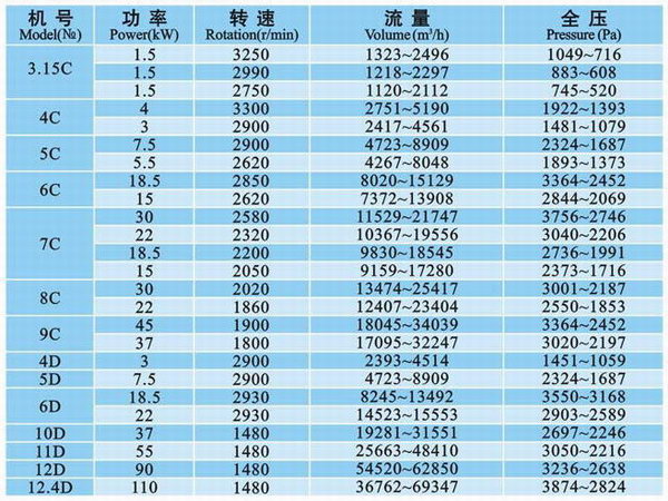 (1)引風(fēng)機(jī)制成單吸入,機(jī)號(hào)有№4、5、6、8、9、12、12.4七種。